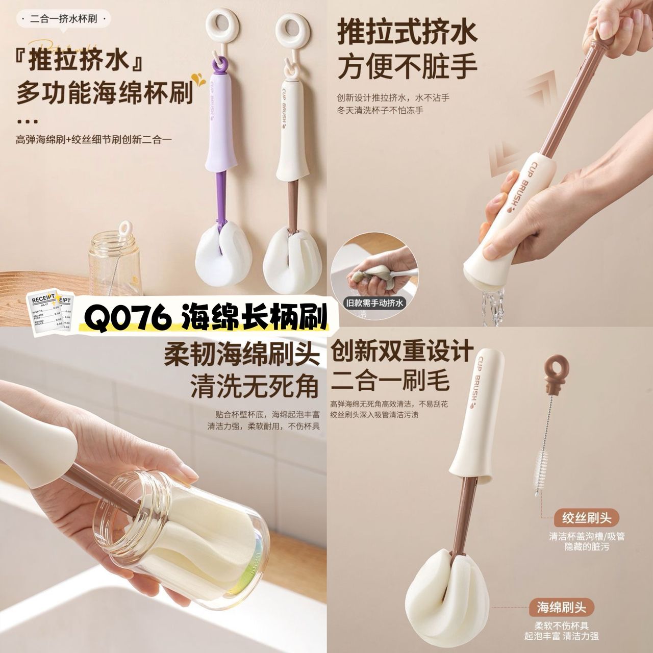 洗杯子、水壶或奶瓶时轻松好用‼️,加长手柄深入底部不费力,柔软海绵刷头不伤表面又能快速去污