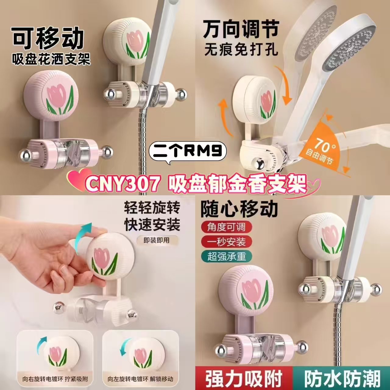 吸盘郁金香花洒支架 打孔喷头淋浴固定器 承重固定收纳移动调节底座❗️