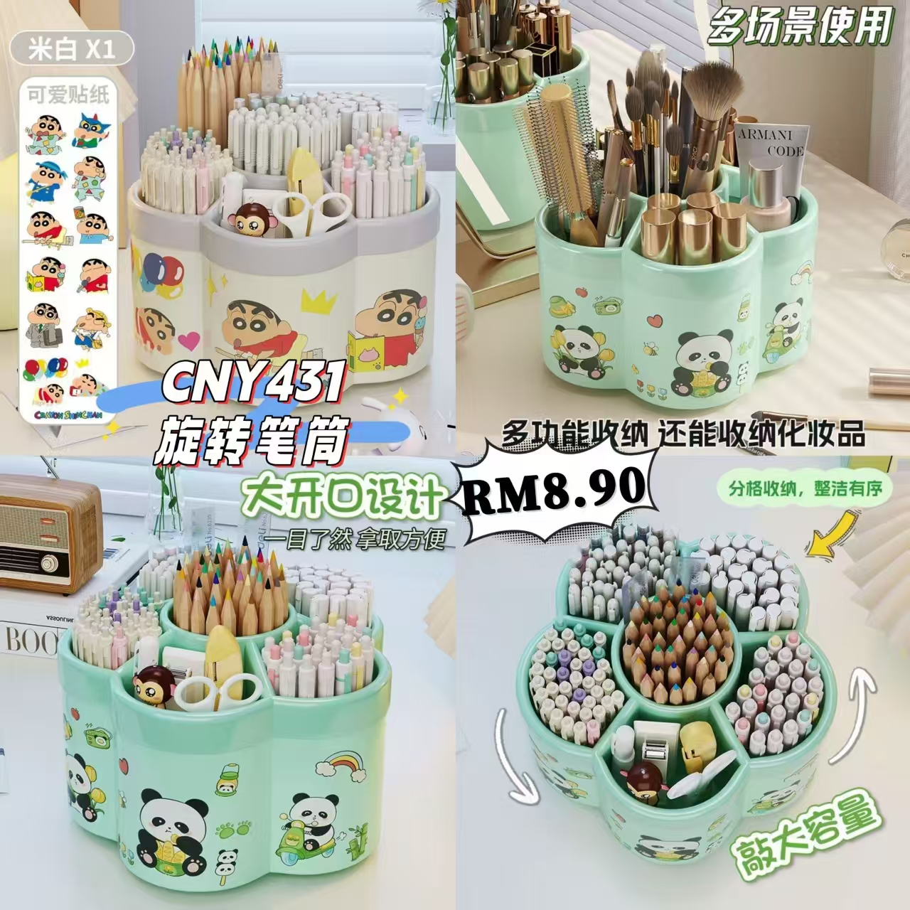 360度可旋转笔筒 蜡笔小新~熊猫图案是贴纸 多功能可爱文具收纳盒