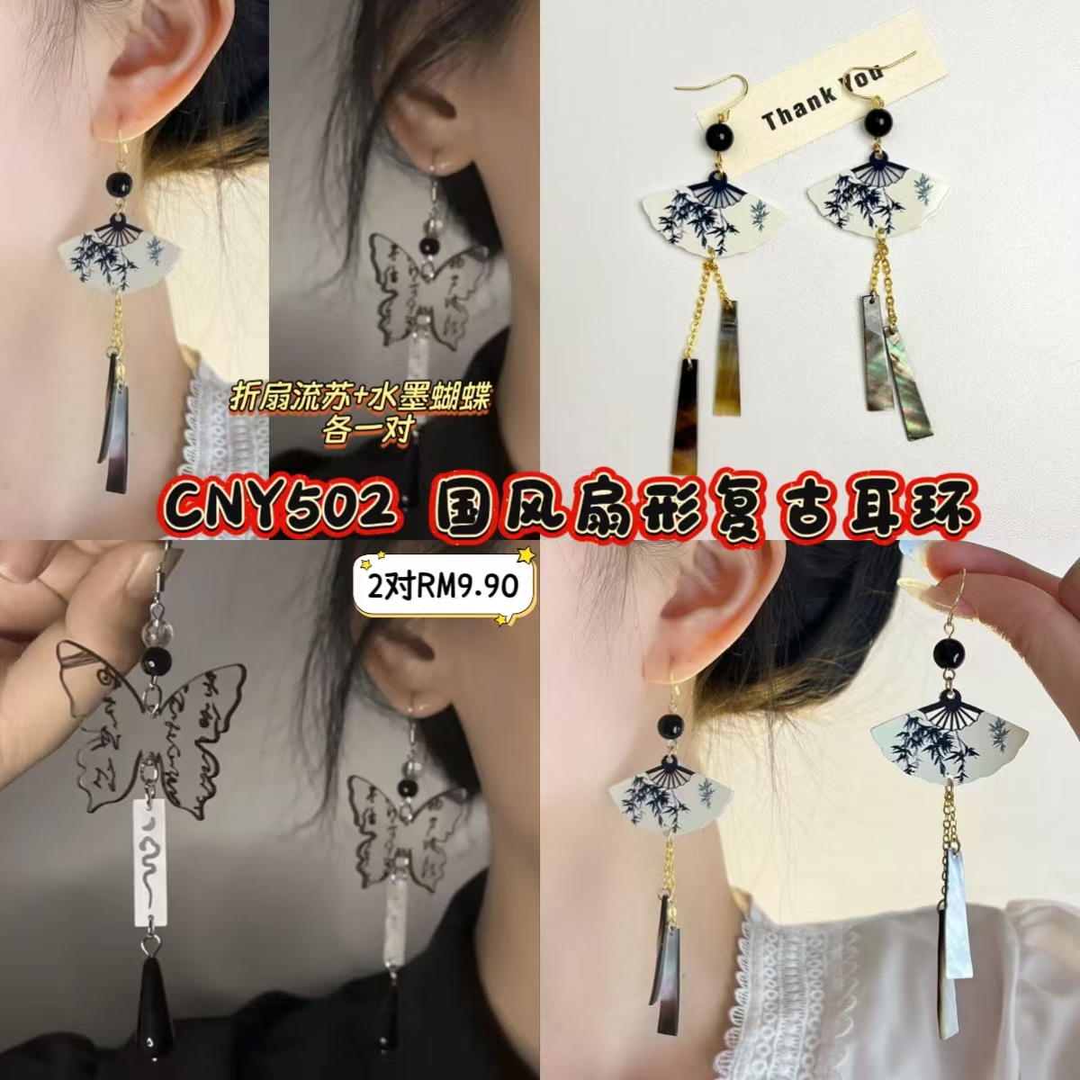 CNY502 国风扇形复古耳环 (2对)