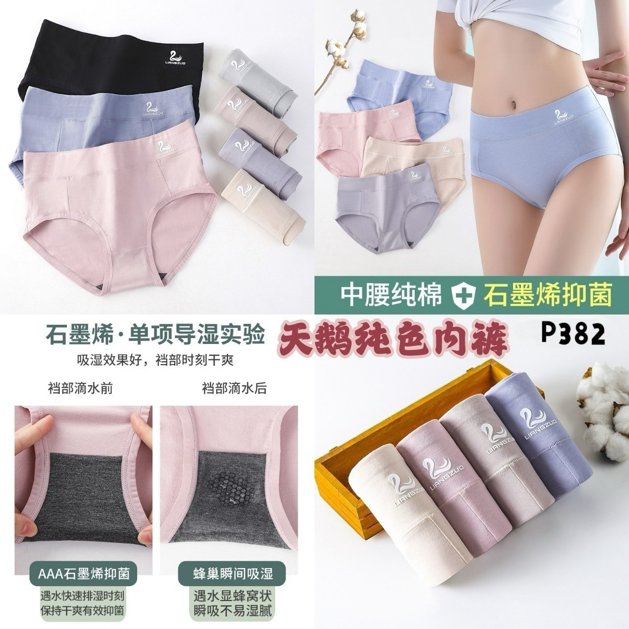 中腰款纯棉布料亲肤又透气,穿上不闷热,裆部快速吸水的蜂巢设计,抑菌率高达99%,好穿又安心👍🏻