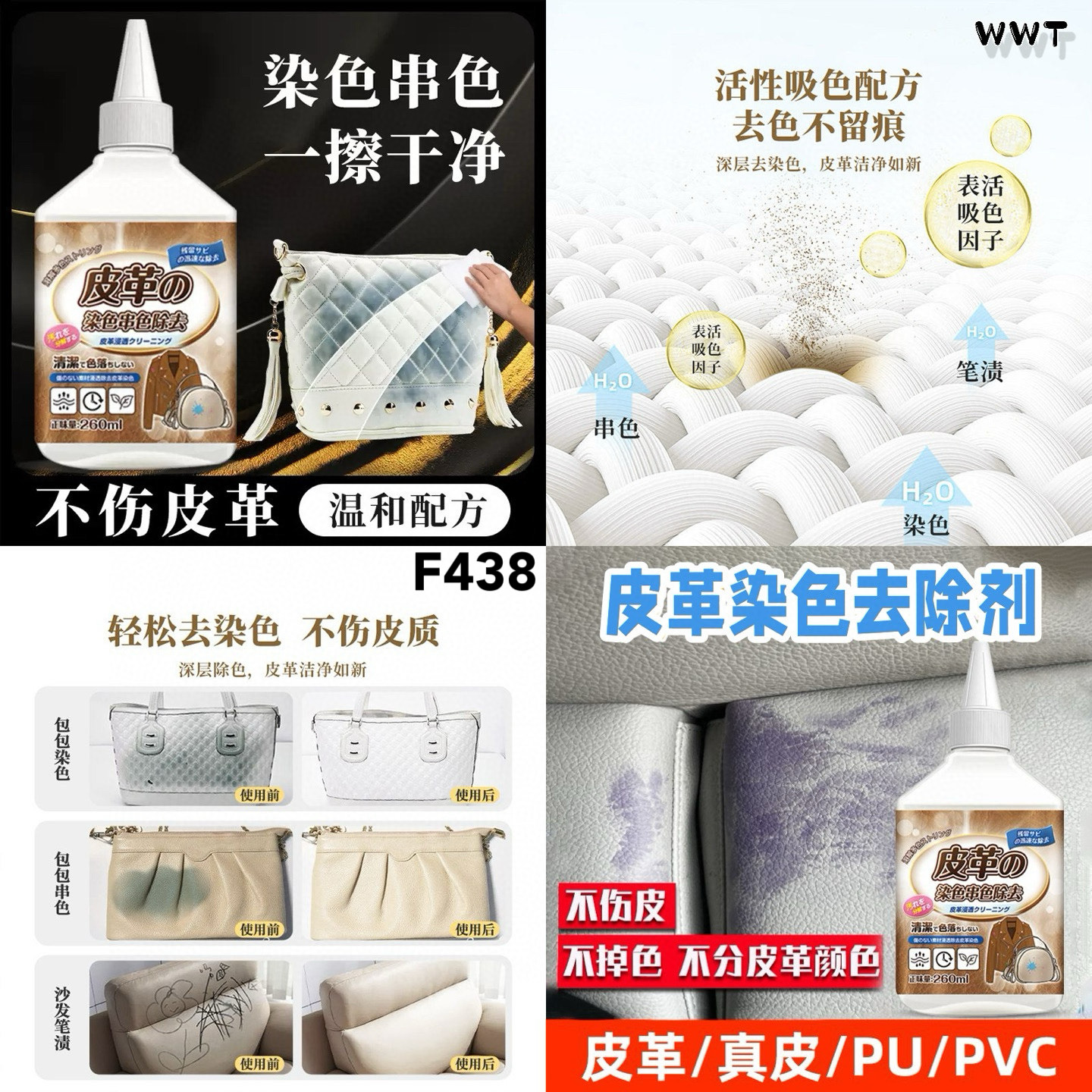 👜轻松去色,不伤皮革!温和配方深层吸附染色,恢复包包原本亮白~适用于皮包、沙发、真皮/PU/PVC材质,1瓶260ml