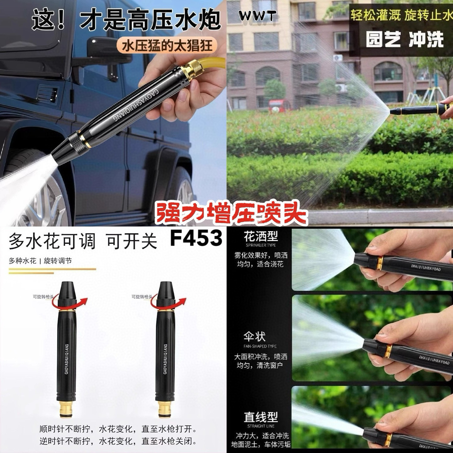 🚿多水花调节,高压冲洗超有力!洗车、浇花、冲地一头搞定~