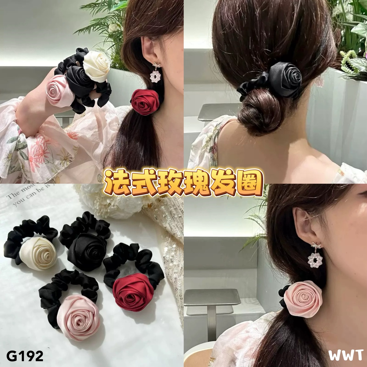 玫瑰花立体感很强,随便扎个马尾都好看,日常出门超加分!
