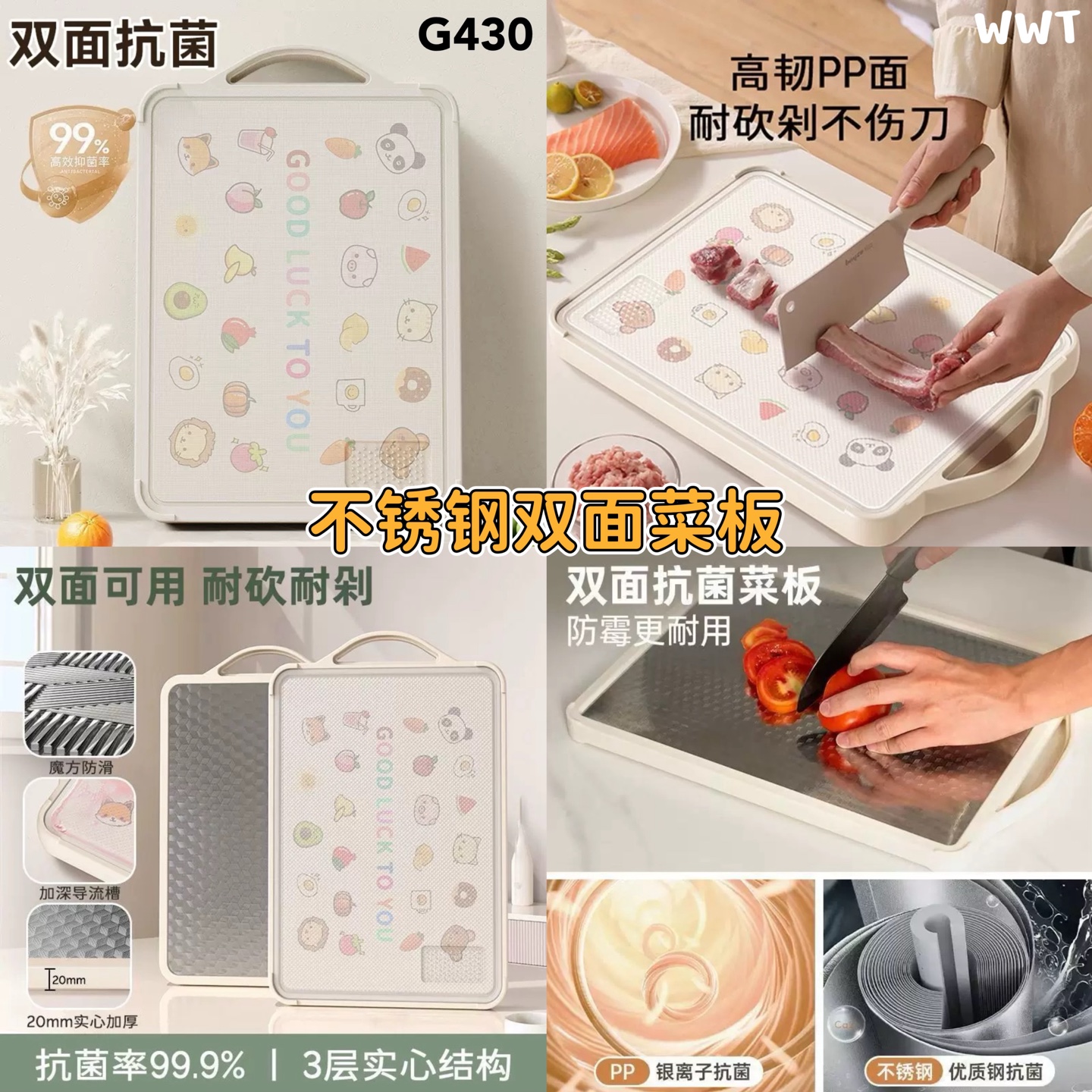 一面高韧PP切蔬菜水果✔️,另一面不锈钢切肉去腥✔️,双面可用更卫生。除菌率高达99%,用着更放心,可立式设计,晾干快还防霉~