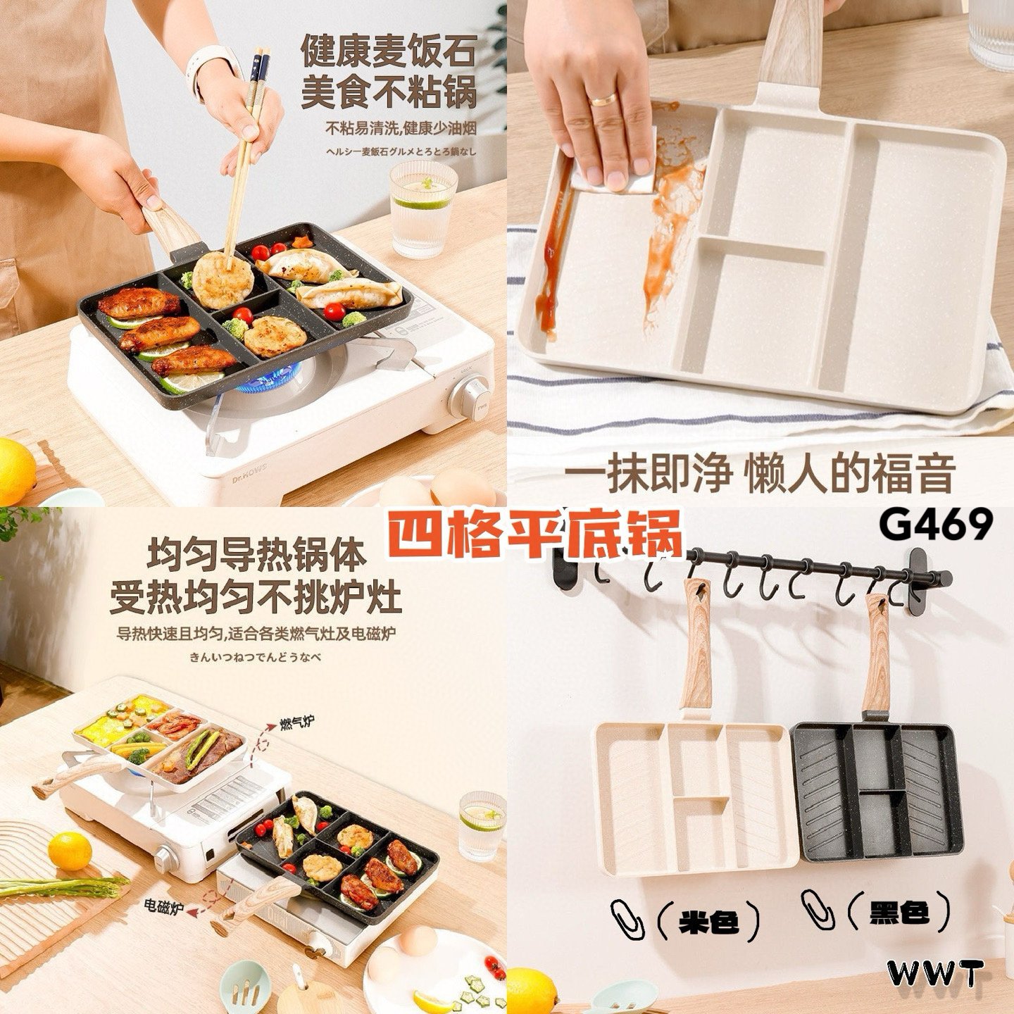四格分区设计,一锅多用,煎蛋煎肉煎饺子都能同时进行。🧽 麦饭石易清洗,导热快又均匀,懒人做饭也能很讲究。