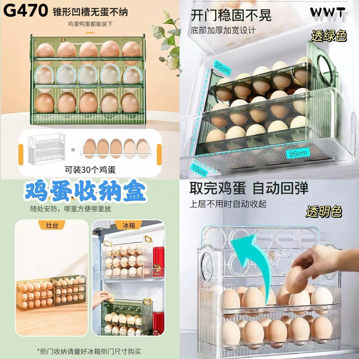 三层大容量,可放30枚鸡蛋,自动回弹取蛋更方便。🧊 冰箱、台面都能放,稳固防滚,不怕蛋碎🤣