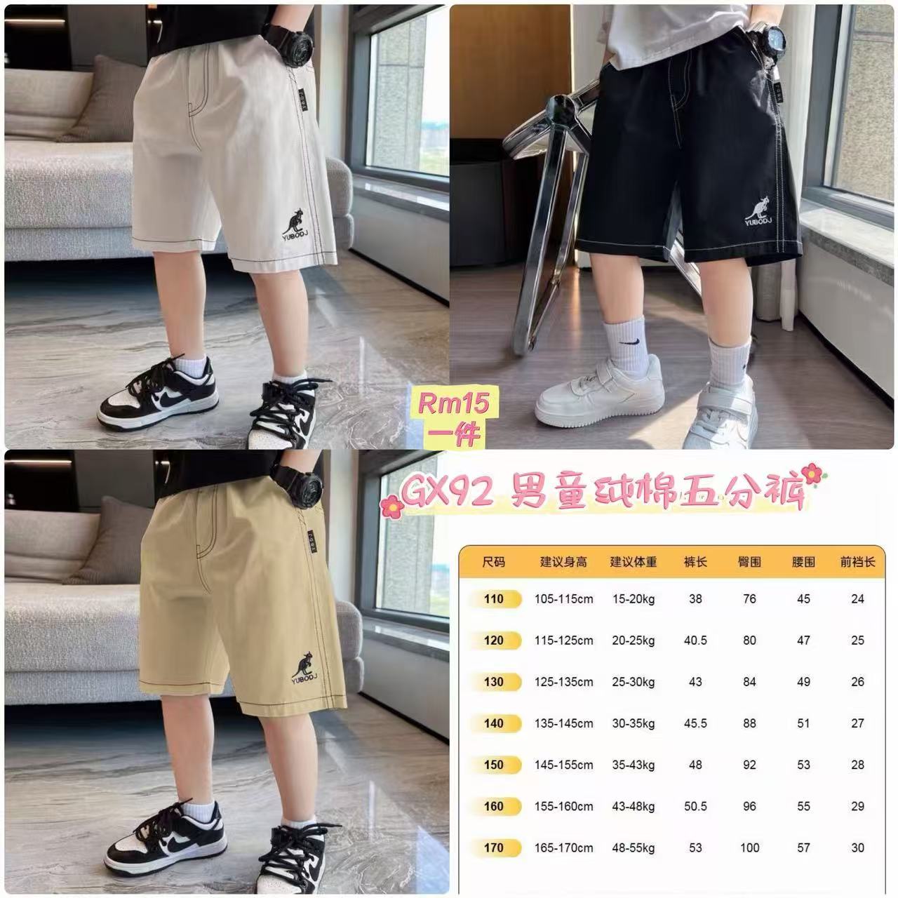 GX92 男童纯棉五分裤 👑 #Rm15 一件 Size👉110-170cm 颜色👉白色 黑色 卡其色