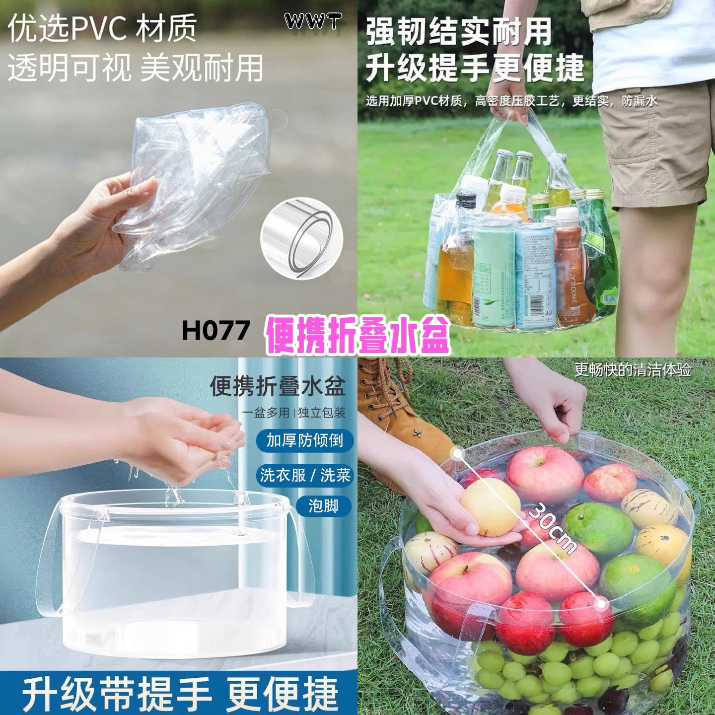 🌊 加大加厚PVC材质,防水耐用,折叠收纳不占地~提手设计更方便。🍎 洗衣服、野餐装水果、户外露营泡脚,多功能实用小神器。