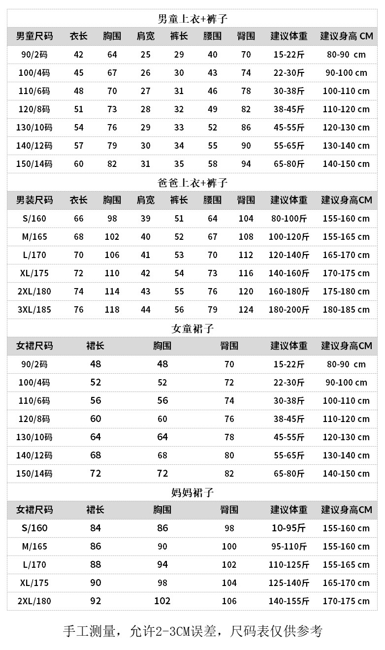 | 尺寸 | 男士上衣-M, 男士上衣-L, 男士上衣-XL, 男士上衣-2XL, 男士上衣-3XL, 男童上衣-90码, 男童上衣-100码, 男童上衣-110码, 男童上衣-120码, 男童上衣-130码, 男童上衣-140码, 男童上衣-150码, 女士连衣裙-S, 女士连衣裙-M, 女士连衣裙-L, 女士连衣裙-XL, 女士连衣裙-2XL, 女童连衣裙-90码, 女童连衣裙-100码, 女童连衣裙-110码, 女童连衣裙-120码, 女童连衣裙-130码, 女童连衣裙-140码, 女童连衣裙-150码 |