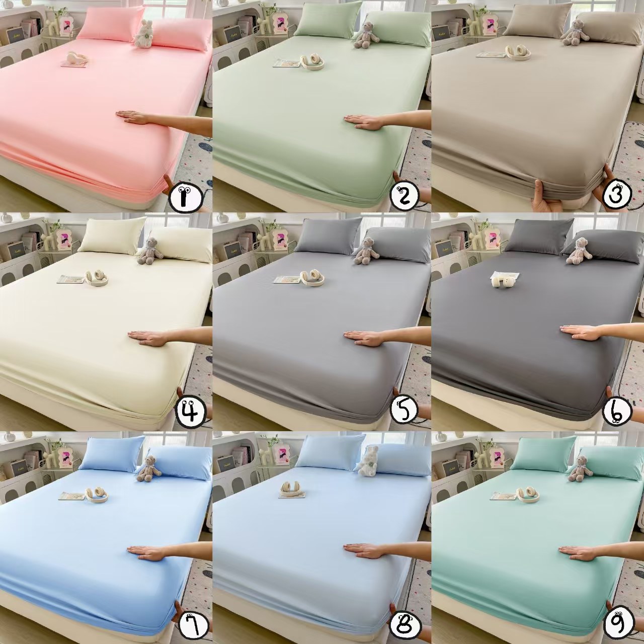 1粉色, 2果绿, 3咖色, 4奶白, 5浅灰, 6深灰, 7天蓝, 8水蓝, 9橄榄绿