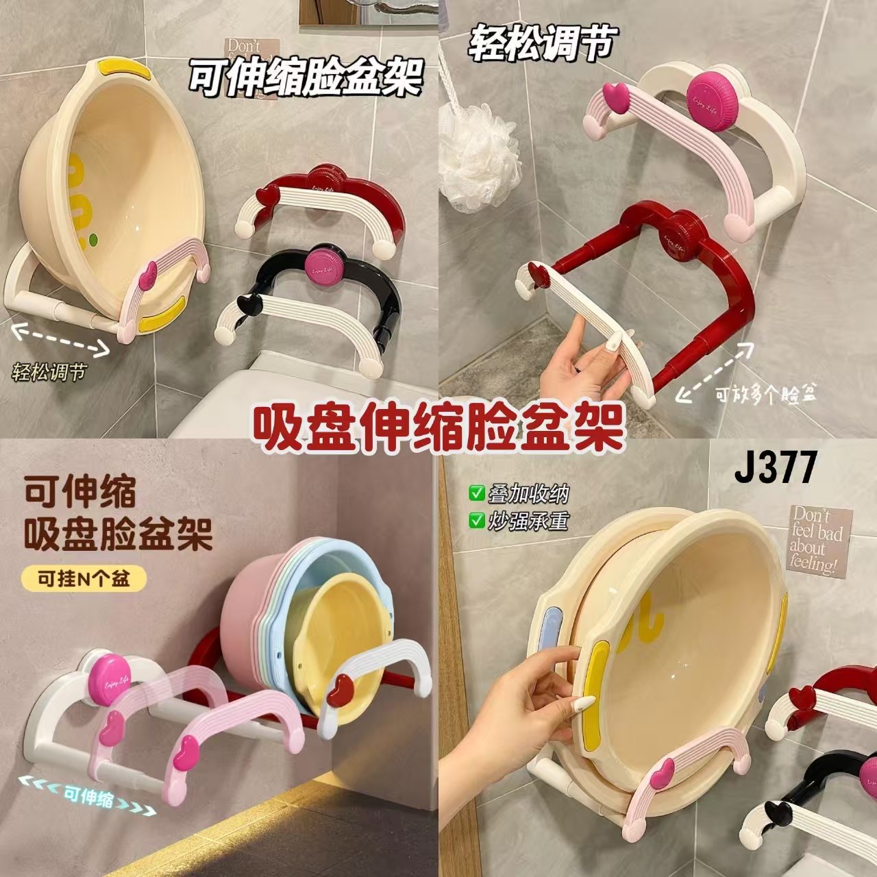 免打孔安装👍🏻👍🏻,强力吸盘稳固不掉落,轻松收纳多个脸盆,可伸缩设计,大小盆都能挂,防潮防积水,取放方便~