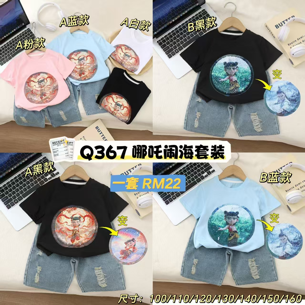 哪吒闹海儿童短袖 舒适透气T恤两件套 男女童亮片短袖卡通上衣
