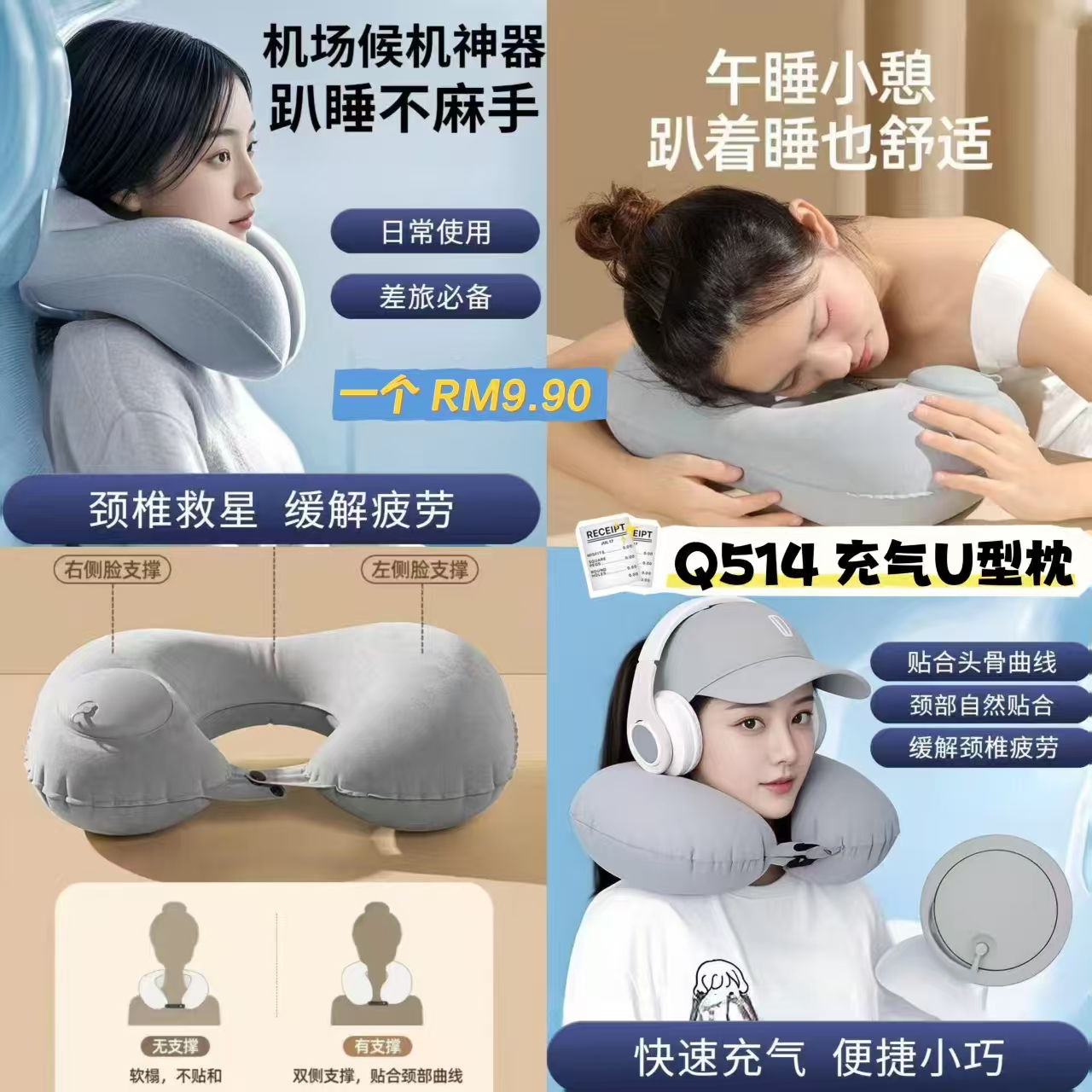 充气式U型枕旅行枕头 便携可折叠按压充气枕头保护颈椎枕减震垫