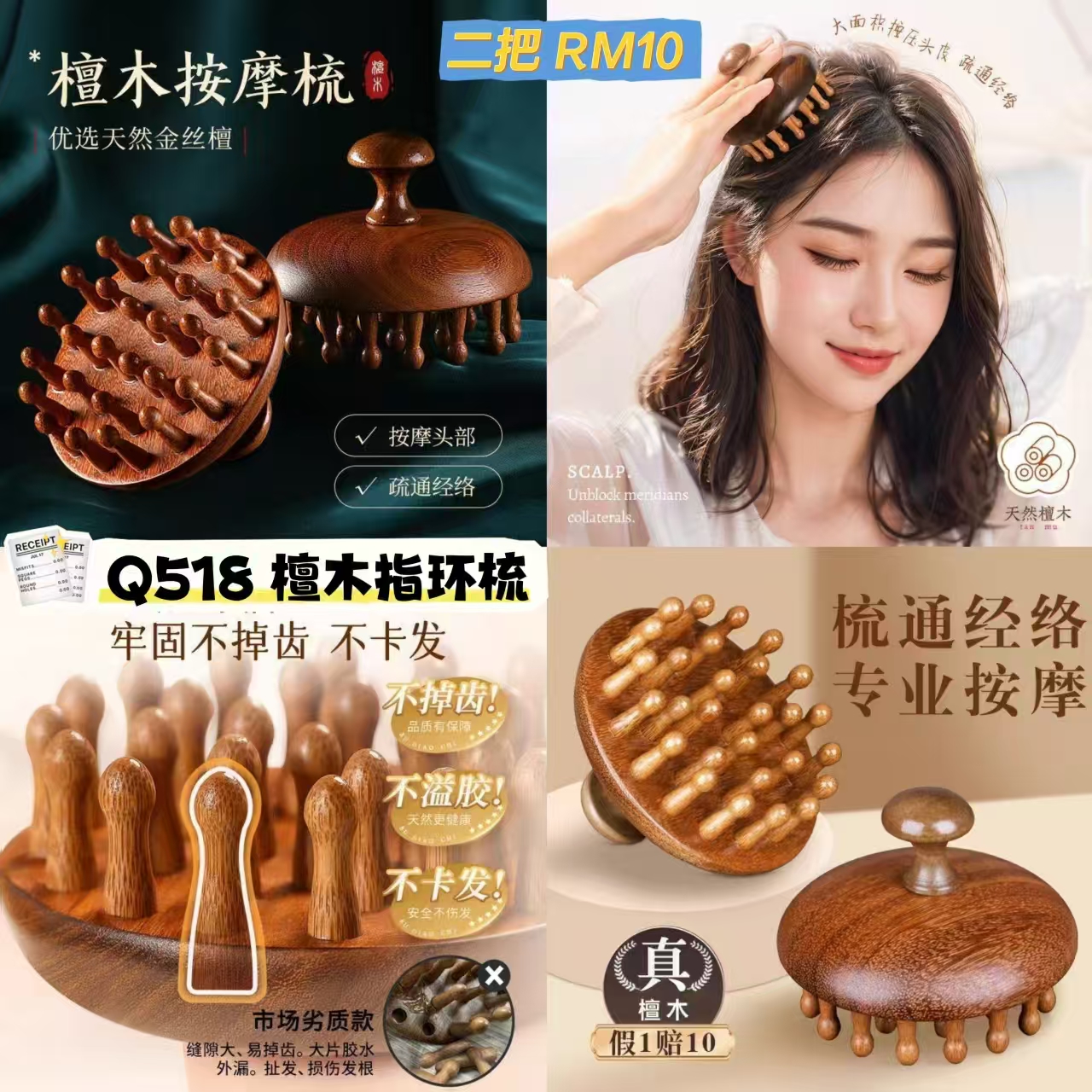 檀木指环梳头皮经络 按摩梳圆盘插齿天然木料头疗洗头刷梳全身用