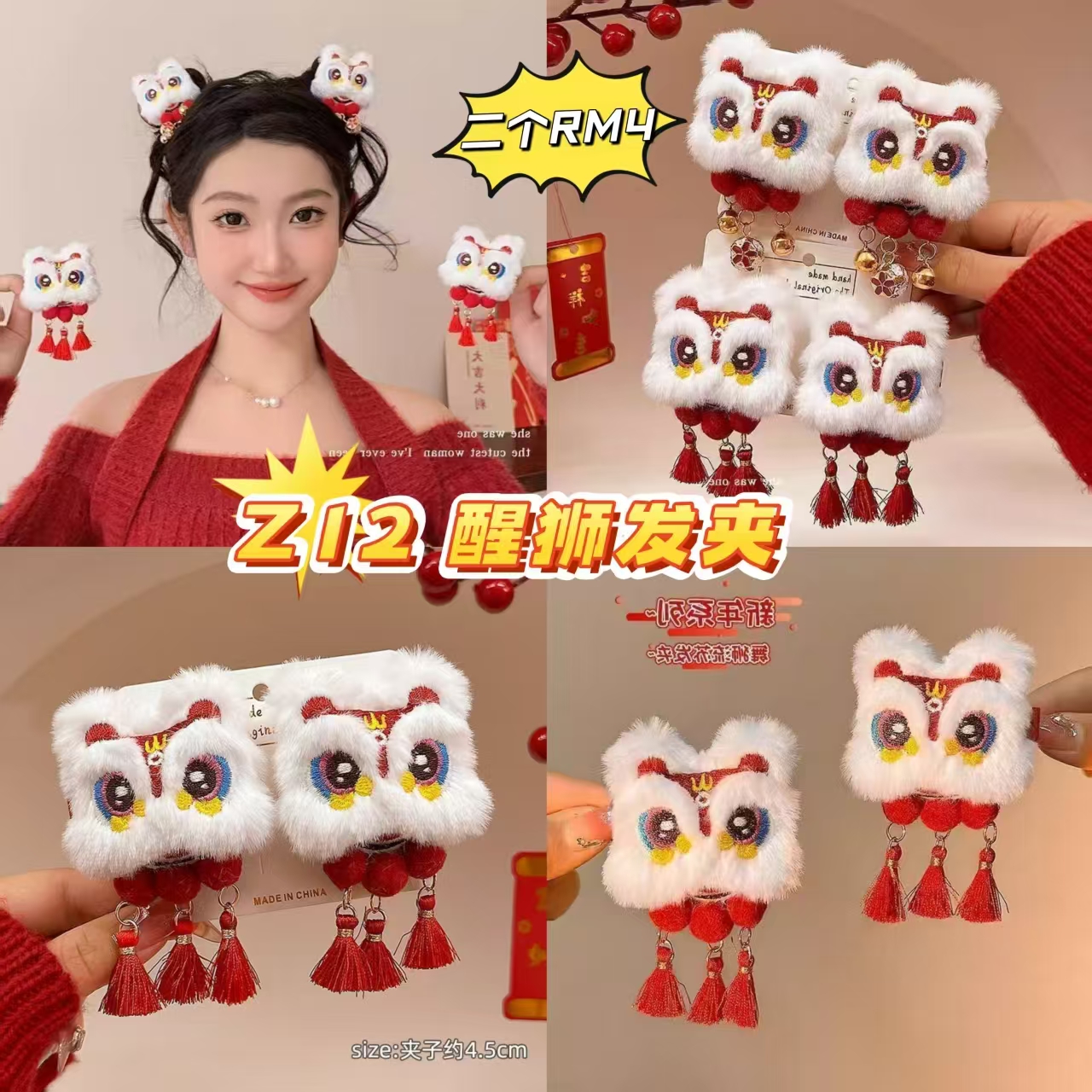 新年醒狮铃铛流苏发夹 侧边刘海夹碎发鸭嘴夹丸子头对夹发饰